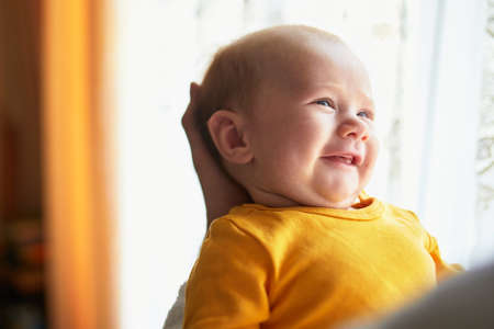 Cute little newborn baby boy in his fathers arms. Portrait of tiny new baby at home. Adorable son being held by his daddy. New bundle of joy.