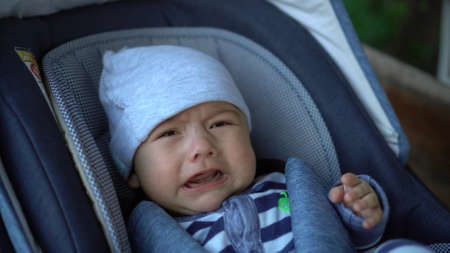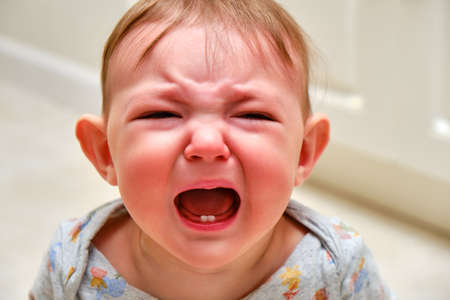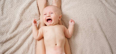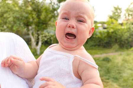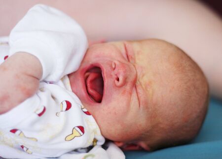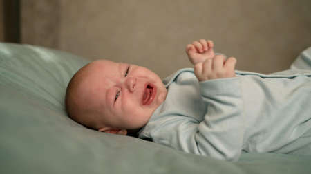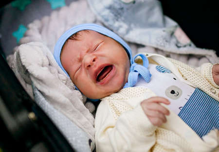 Little two month old newborn baby boy is crying. Screaming hungry infant face portrait close up. Baby experiences pain during colic in the abdomen