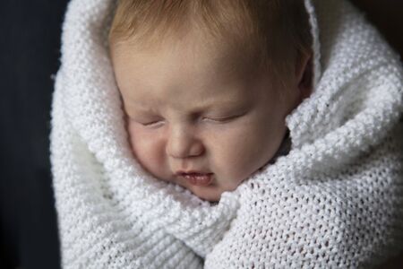 Portrait of newborn baby boy in a blanket lying on the bed.