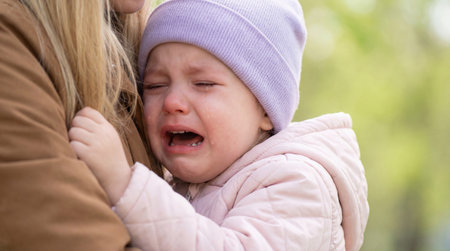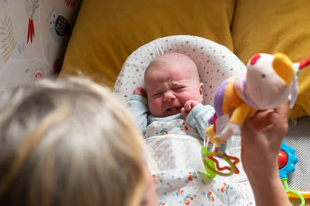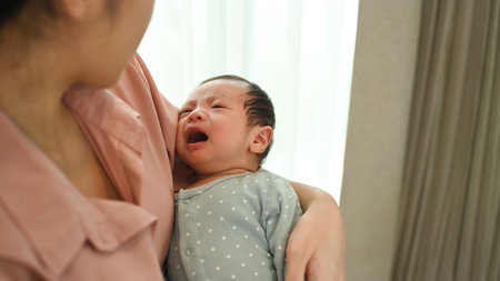 Mother consoling and comforting her crying baby. Child care, motherhood and maternity leave concept.