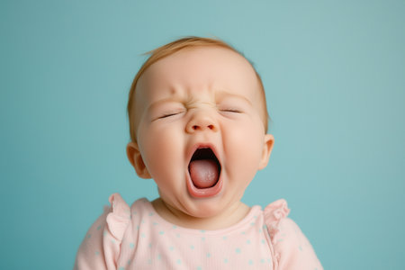 A portrait of a baby with an exaggerated yawn, eyes closed and mouth wide open