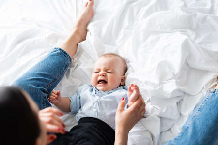 Crying hungry newborn baby lying on the bed. Love baby. Newborn baby and mother.