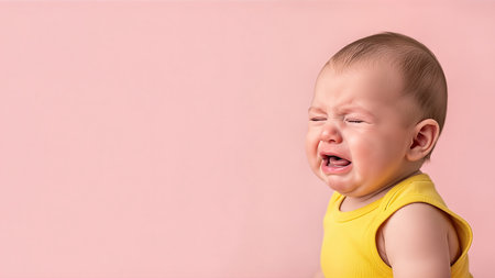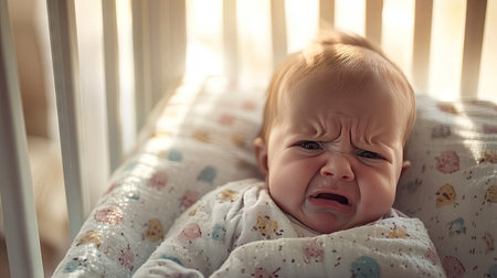 A close-up of a distressed baby with a frowning expression lying in a crib, surrounded by soft bedding, illuminated by warm morning sunlight.