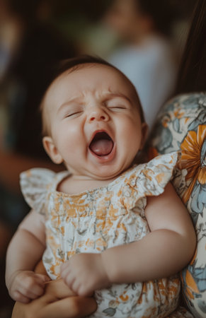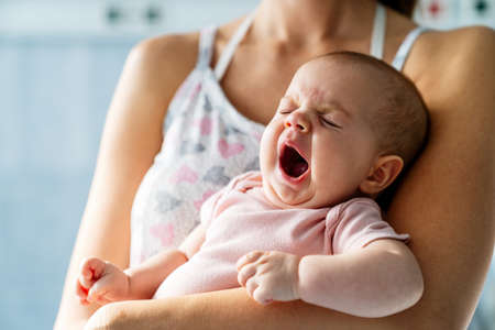 A portrait of sleepy cute newborn baby carried by her mother yawning