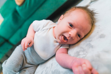 Little female baby in grey bodysuit screams out loudly calling mother. Scared newborn girl lies on bed against bright window in room, closeup
