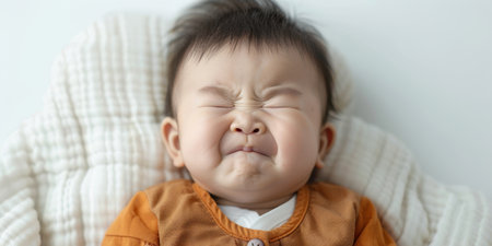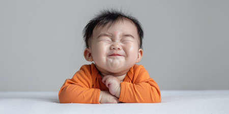 Crying Baby Portrait Unhappy Asian Newborn in Orange Shirt