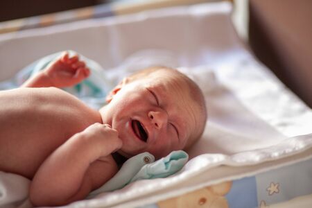 newborn baby boy crying in his crib. Newborn baby boy in bed.