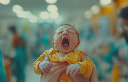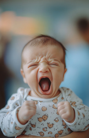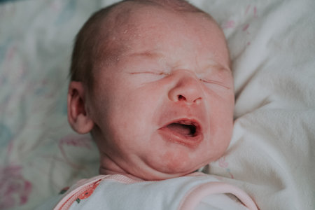 This image captures a newborn baby crying, showcasing the raw emotions of infancy. Surrounded by a cozy blanket, the soft light enhances the tenderness and innocence.