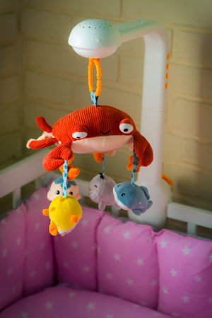Bright plastic toy mobile for newborn is hung at headboard of baby bed. Orange, blue animals hang on spinning musical game mount. Interactive toys that develop senses. Children bedroom decorations