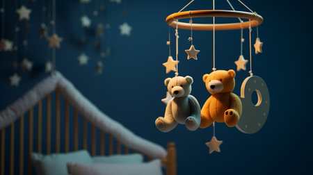 A charming teddy bear mobile designed for a baby nursery, featuring soft textures and pastel colors, perfect for creating a cozy atmosphere.
