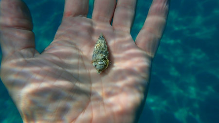 Small hermit crab or south-claw hermit crab, Roux's hermit crab (Diogenes pugilator) on the hand of a diver, Aegean Sea, Greece, Halkidiki