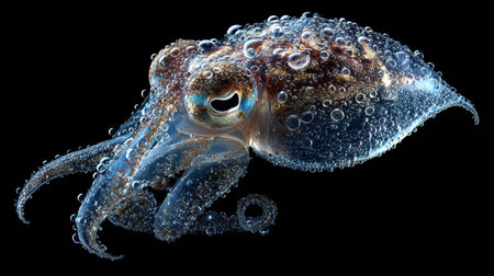This vivid close-up image captures a squid swimming gracefully through dark water, surrounded by bubbles. The stunning colors and details highlight the creature's beauty and uniqueness in its natural habitat.