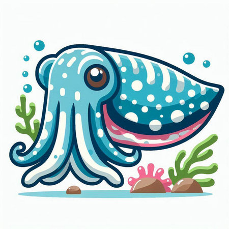 A vibrant squid swims gracefully through the ocean, surrounded by bubbles and coral. This captivating underwater scene showcases the beauty of marine life and its colors.