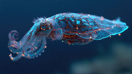 A cuttlefish displays intricate patterns and colors while swimming in deep water. The image features a close-up of the creature's bioluminescence, with a mix of blue and orange hues. The composition uses a dark background to emphasize the cuttlefish. This image could be used for educational materials or design projects.