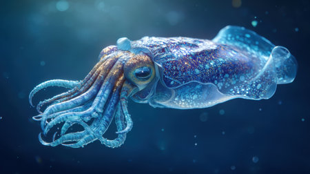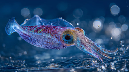 A stunning close-up image of a vibrant squid gracefully swimming through the deep blue ocean, illuminated by soft rays of light, showcasing its unique features.