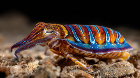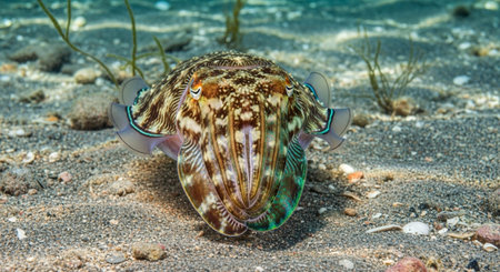 A stunning close-up of a vibrant cuttlefish resting on a sandy ocean floor, showcasing intricate patterns and vivid colors typical of marine life.