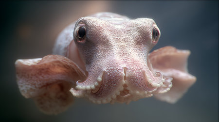 A Dumbo octopus Grimpoteuthis swimming gracefully in the deep ocean, surrounded by a dark, serene underwater environment, showcasing its translucent body, ear-like fins, and unique bioluminescent features.