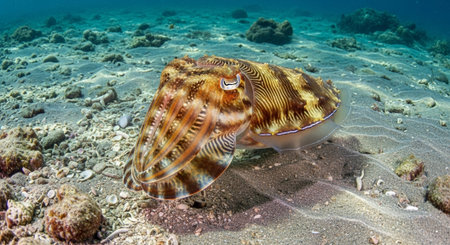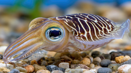 This image showcases a cuttlefish in an aquatic habitat. It presents a close-up view revealing intricate patterns and colors. The composition highlights the animal's features against a backdrop suggesting underwater conditions. This image could be suitable for scientific publications or educational materials, and also general commercial uses.
