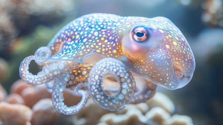 A vibrant squid glides gracefully through clear water, showcasing its beautiful colors and unique texture. A stunning underwater scene full of life.