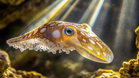 A vibrant squid glides gracefully through the ocean depths, illuminated by sunbeams. This stunning underwater capture showcases marine beauty and biodiversity.