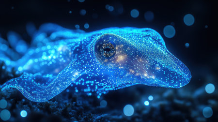 A squid gracefully moves through dark ocean waters at night, showcasing its stunning features