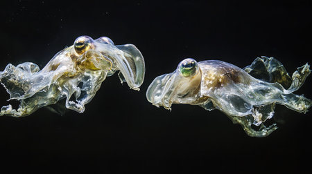 A pair of cuttlefish hover in midwater, their colors shifting as they communicate