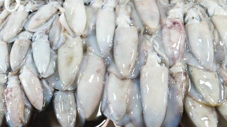 Fresh Squid on a market stall. Closeup fresh squid on the market. Fresh seafood. Fresh seafood market in Asia.