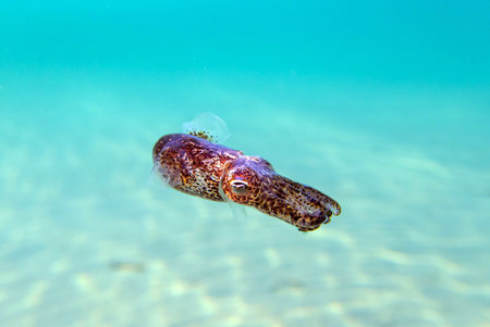 This vibrant image features a squid gracefully swimming through the clear blue waters of the ocean, showcasing its stunning colors and fluid movement.