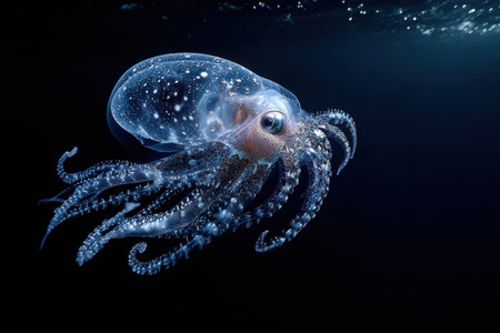 A translucent squid swims effortlessly in the deep ocean, illuminated by a single beam of light