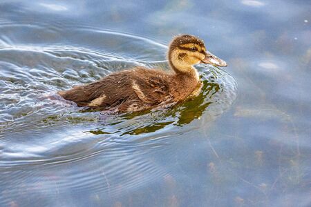 Little duckling swimming in the water. Shallow depth of field.