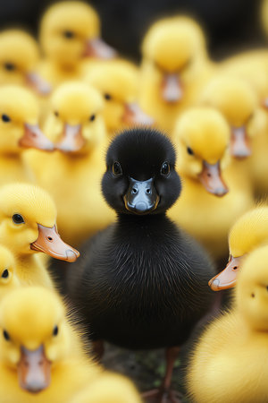 Black duckling standing out among yellow ducklings, all walking in line with a serious expression