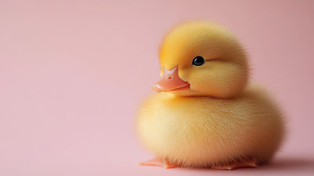 A fluffy yellow duckling sits gracefully against a soft pink backdrop, showcasing its round shape and bright eyes.