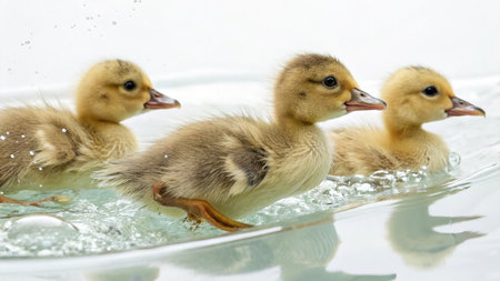 Five adorable yellow ducklings swimming together in shallow water enjoying a sunny day