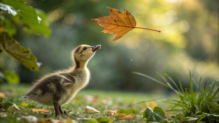 Cute little gosling in the green grass with a yellow leaf