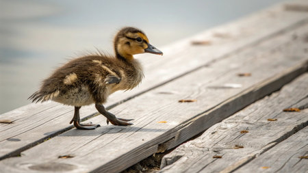 duckling on a wooden pier by the lake in springtime