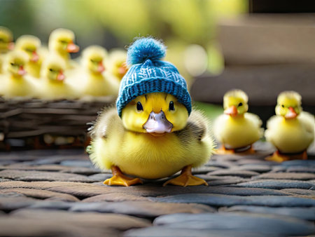 A small yellow duck wearing a knitted hat. Generated with AI