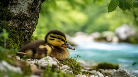 A content duckling napping in the shade of a tree by a crystal-clear river.
