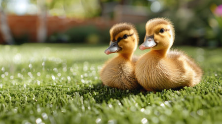 innocence of nature with our closeup image of cute fluffy ducklings on artificial grass against a blurred background. Adorable!