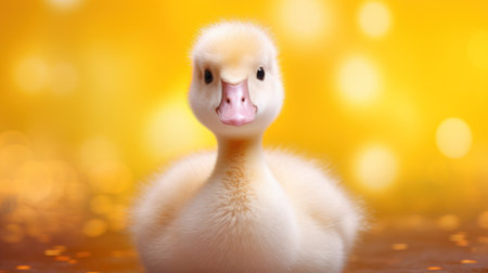 Cute little duckling on yellow bokeh background with copy space