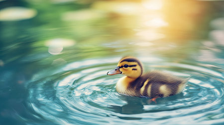 Cute duckling swims peacefully in calm water surrounded by ripples under soft sunlight