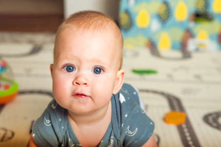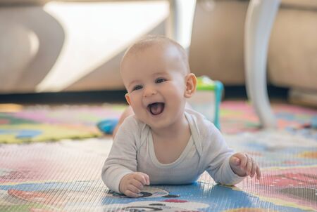 little cute baby toddler on carpet close up smiling adorable happy emotional playing at home