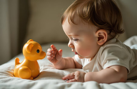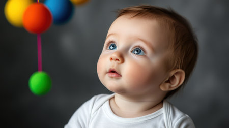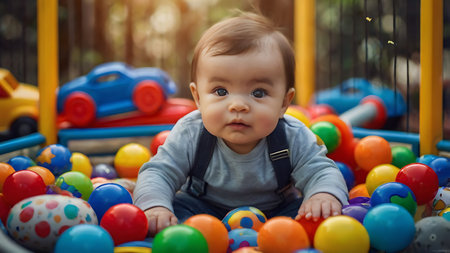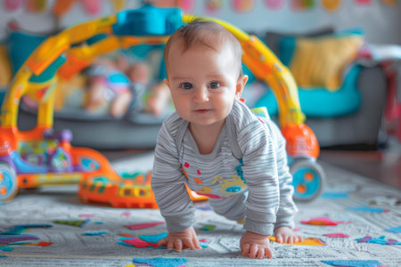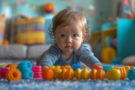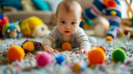 Adorable infant in a onesie reaching out, surrounded by colorful toys, depicting the wonder and exploration of early life.