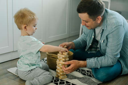Father and son playing with toys in the children's room at home