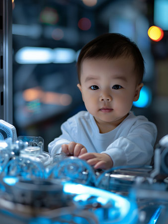 Cute asian baby boy playing with robot in blue light.