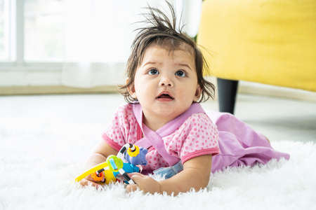 Eight months old baby girl laying on the floor playing with her toys