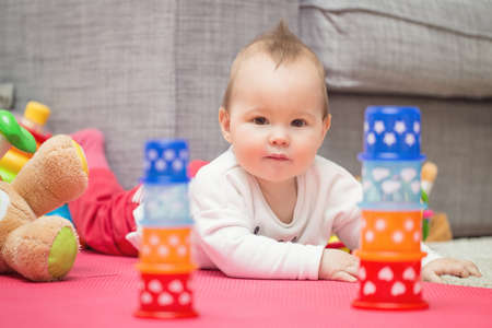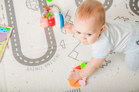 Baby plays on floor with educational toys, rattles and teething toys. Crawling babies at 8 months.
