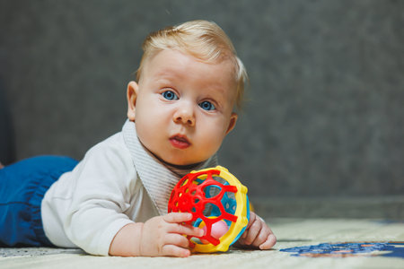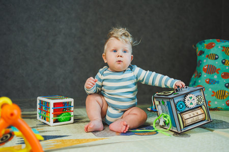 Baby plays at home with educational toys close-up and copy space. Child facial expressions at 7 months