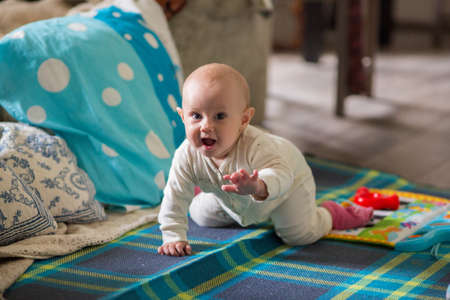 adorable infant plays on floor in the room with furniture, soft focus
