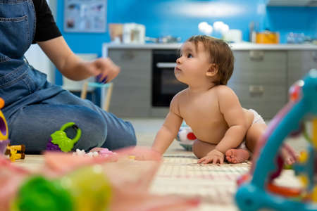 Cute adorable little funny infant caucasian newborn baby sitting on floor and enjoy playing toys and rattles with mother at kitchen or living room home. Child day care and healthy development concept