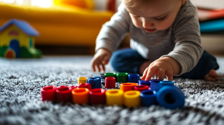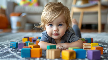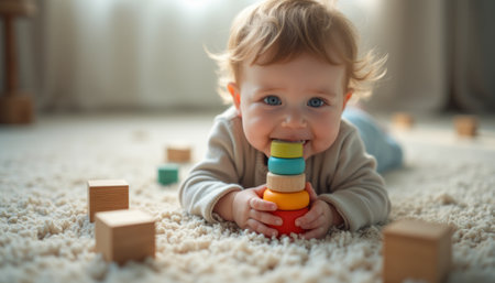 A cheerful baby with curly hair is lying on a soft carpet, happily stacking colorful wooden blocks. The scene radiates joy and innocence, capturing the essence of early childhood exploration and play.